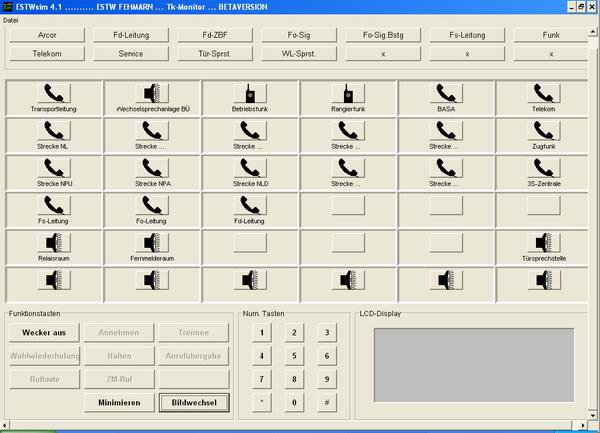 Bei dieser neuartigen Siemens-ESTW-Simulation ist es erstmals möglich, die neue ESTW Bedienung ( Systemvertrag 2 ) per Maus durchzuführen. Alle Fahrstraßen werden per Start-Zielpunkt mit der Maus angeklickt und bestätigt. In dieser Simulation sind insgesamt 7 einzelne Lupen schaltbar, sowie 3 Bereichsübersichten. Der Wechsel zwischen den benachbarten Lupen sowie Berü`s erfolgt mit den Cursor-Tasten, dies ermöglicht eine schnelle, komfortable und vorallem effiziente Übersicht über das komplette Betriebsgeschehen. Somit sind fast alle Ansichten wie bei einem realen ESTW möglich. Die Bedienung des recht umfangreichen Stellbereiches ist auch aus der Bereichsübersicht möglich. Es sind zahlreiche Bahnübergänge in die Lupenansichten integriert, welche ebenfalls bedient und überwacht werden müssen. Info / Download: http://www.estwsim.de