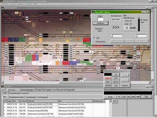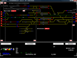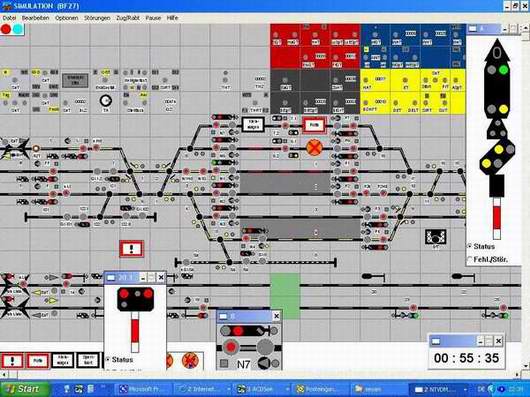 Bei dieser Drucktasten- bzw. Spurplanstellwerkssimulation handelt es sich um eine tatsächliche Ausbildungssoftware, die auch heute noch bei der Deutschen Bahn AG und anderen Bahngesellschaften eingesetzt wird. Jedoch meist als Client/Server Variante, bei der die Züge, sowie Störungen oder sonstige Ereignisse vom Ausbilder am Master- bzw. Serversystem generiert werden. Leider steht dieses Simulationsprogramm der Öffentlichkeit nicht zur Verfügung, daher auch kein Link oder eine Angabe einer Bezugsquelle. Diese Simulation ist sehr detailiert und absolut identisch mit der Vorbildtechnik, auch sämtliche Unregelmässigkeiten und Störungen können simuliert und an den Schulungssystemen getestet werden. Auch die Anzeige der Signalschirme bzw. Signalbilder kann zu Lern- und Infozwecken eingeblendet werden. Sämtliche Zugarten, Zugnamen/Nummern, Richtungen und Geschwindigkeiten können generiert werden. Die generierten Züge können auch per "Handbetrieb" bewegt bzw. gefahren werden. Das Erstellen eigener Gleisbilder ist mit Hilfe eines integrierten Editors ebenfalls möglich. Dabei muß jedoch jedes einzelne Gleis-/Weichen-/Signalelement benannt und konfiguriert werden. Leider fehlt bei dieser Simulation eine integrierte Zugnummernmeldeanlage die in den meisten realen SpDr / Dr Stellwerken entweder als Ziffernbausteine ( Projektion / LED / Matrix ) im Stelltisch / Stellwand oder als externe Monitorlösung realisiert ist. Diese Programm ist leider nicht frei erhältlich und daher ohne Nennung einer Bezugsquelle.